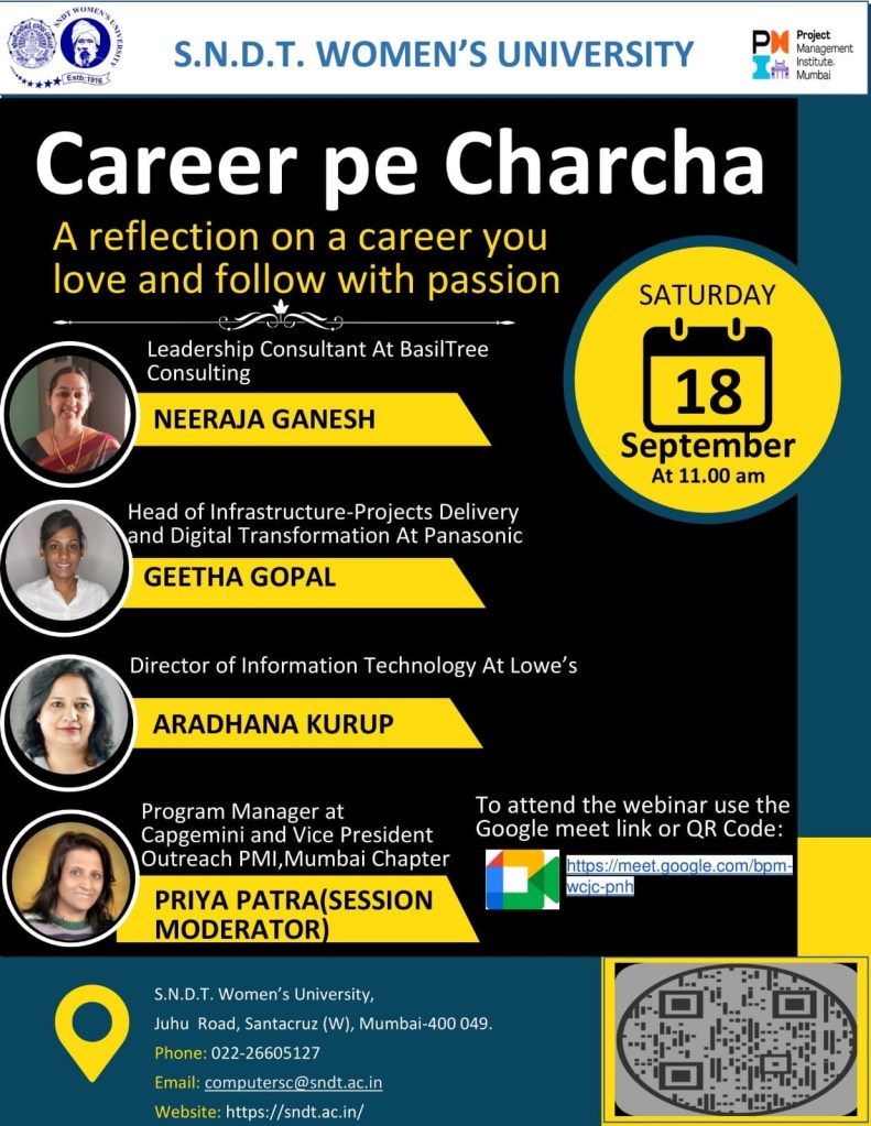 On 18-Sep-21, I had the privilege to be a guest speaker at the Career pe Charcha- session organised by SNDT Women’s University’s – P. G. Department of Computer Science. This is my first speaker event for an all women’s academic group!