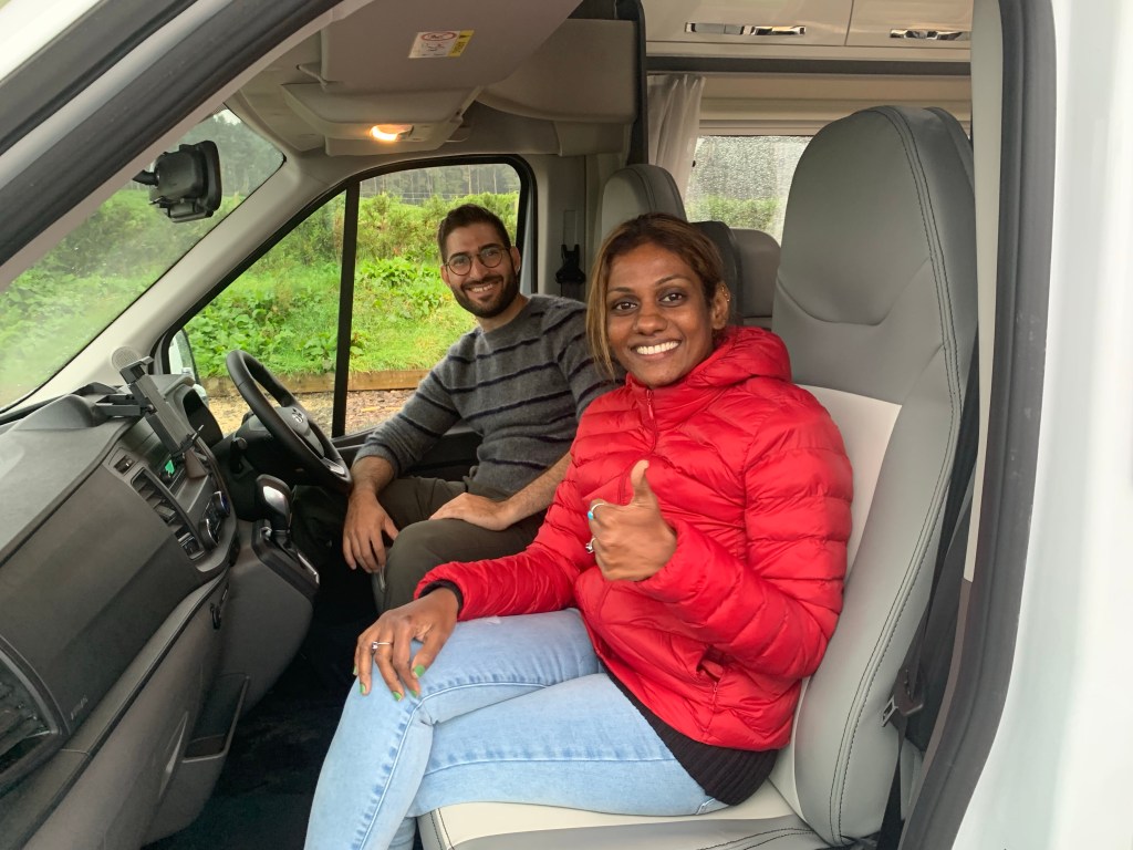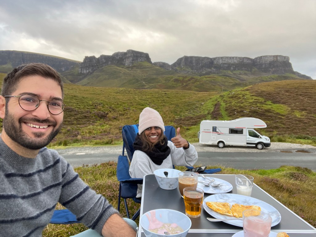 So I convinced my #daredevil best friend Chris Devine to join me on a trip to explore Western Scotland. We hired a large luxury motorhome (that can sleep 7 – we both wanted our own private wings on that RV :)) and planned an agenda across the Isle of Skye! As our friend Jonathan says, “Scotland, especially Isle of Skye is the most beautiful place on earth when the weather is good.” Though our trip started with rain showers and gray skies, we could see what Jonathan meant once we saw the weather turn great from day 2 onwards. With blue skies, Isle of Skye truly felt like heaven on earth! Since we covered a lot of places and did a lot of activities, I have split this blog into sections for each day and tried to document the day to the best of my memory. Each day was an adventure on its own!