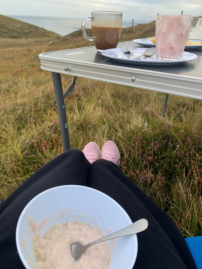 As always, it was a beautiful surprise to wake up and see the landscape of where we had parked in the night! Another dawn, another mesmerising sight! There was no sound from any vehicle passing by, even for 15 mins after I woke up. It was us, some sheep right outside our door, the mountains, a hidden Loch to our left and the deep blue sea below to our right!