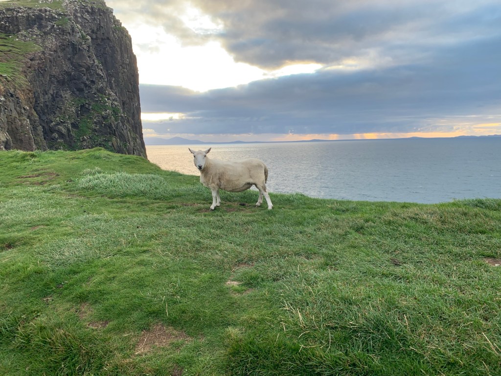 I woke up early and Chris’ private corner was quiet, so I decided to step out and explore on my own again. As I stepped out, I was mind blown by the splendour of the landscape about which we had no clue while we drove in during the previous night to park. There were mountains, ridges and grazing sheep on one side and a steep cliff behind a little hill, overlooking the North Atlantic Ocean. The Lealt Falls had less water but looked formidable nonetheless!