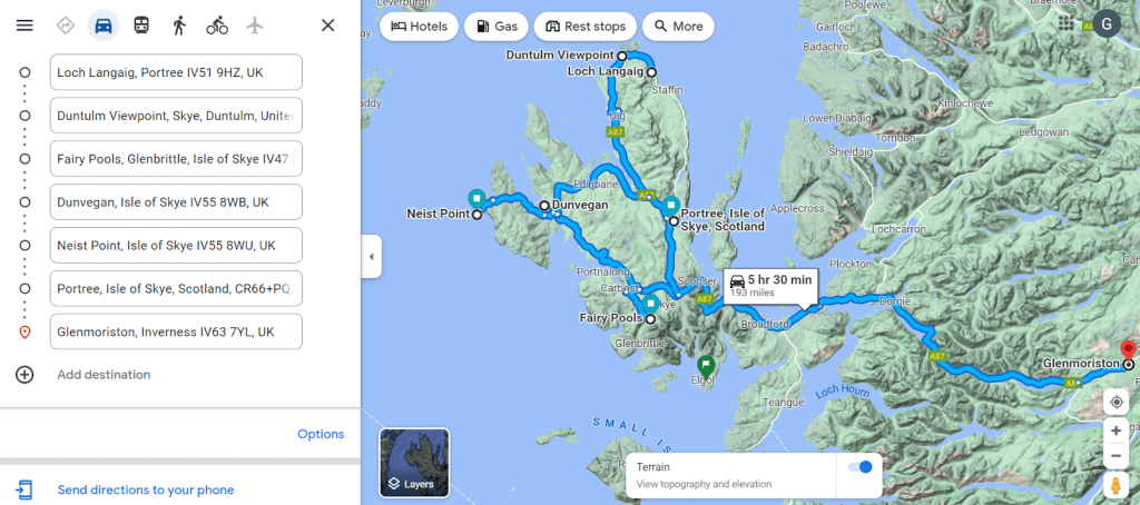 After that beautiful sunset experience in Neist Point, we bade good bye to the sheep and cows and made our way towards the east! We had planned to drive as much as we can, exit the single track and hit the double lane highway while there was still some daylight! The duration shown on Google maps was no way near the reality on those narrow highland roads. On a 60mph road, we could only do 30mph due to various factors like vehicles on the opposite side for whom we had to give way, heavy trucks ahead, etc. By the time we reached a more comfortable driving lane, it was late in the night!